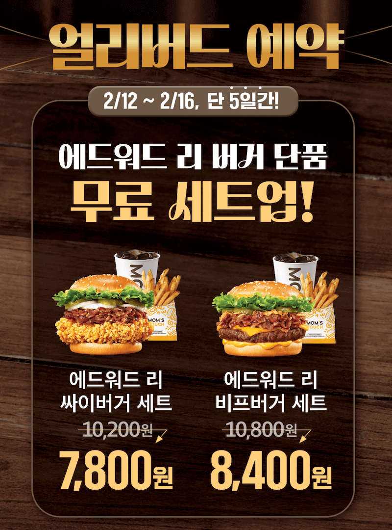 이번 맘스터치 X 에드워드 리 메뉴는 한정된 기간 동안 사전 예약을 통해 먼저 만나볼 수 있습니다.