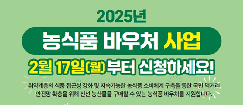 2025년 농식품바우처 신청이 시작되었습니다! 올해 지원 대상이 일부 축소된 만큼, 해당되시는 분들은 신청 기간 내 빠르게 신청하시어 혜택을 꼭 받으시길 바랍니다.